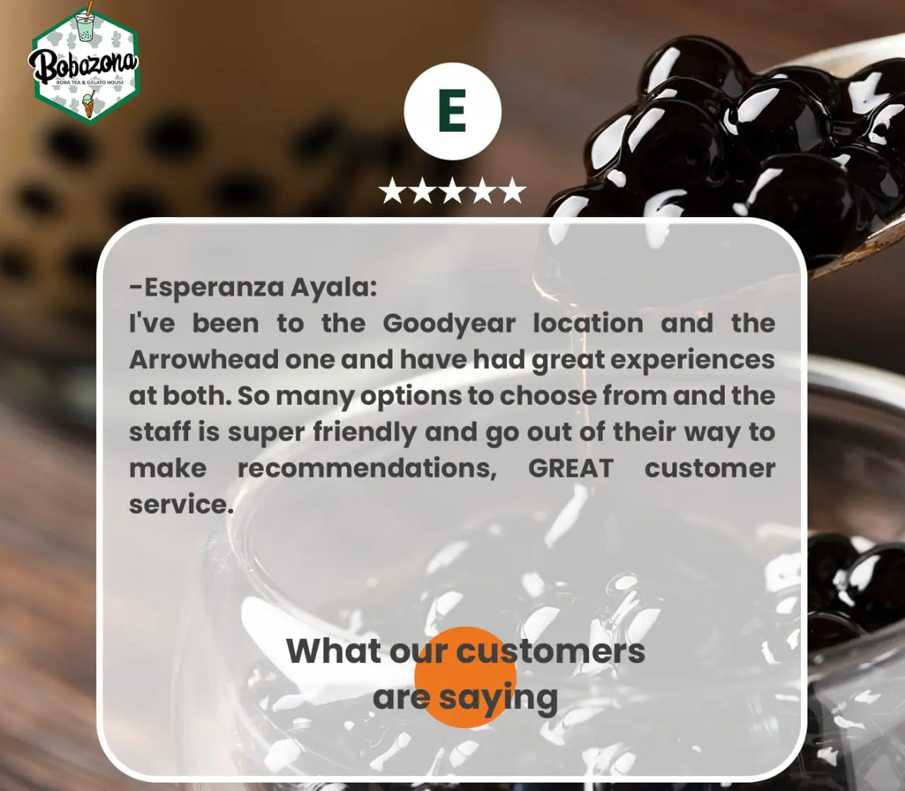 Bobazona opened July 25th of 2020 in Goodyear, Arizona. We are a young family that fell in love with boba over 5 years ago and we had a desire to start our own business. After hours of classes, we learned how to craft the perfect drink for whatever the occasion may be.